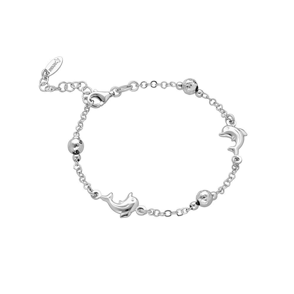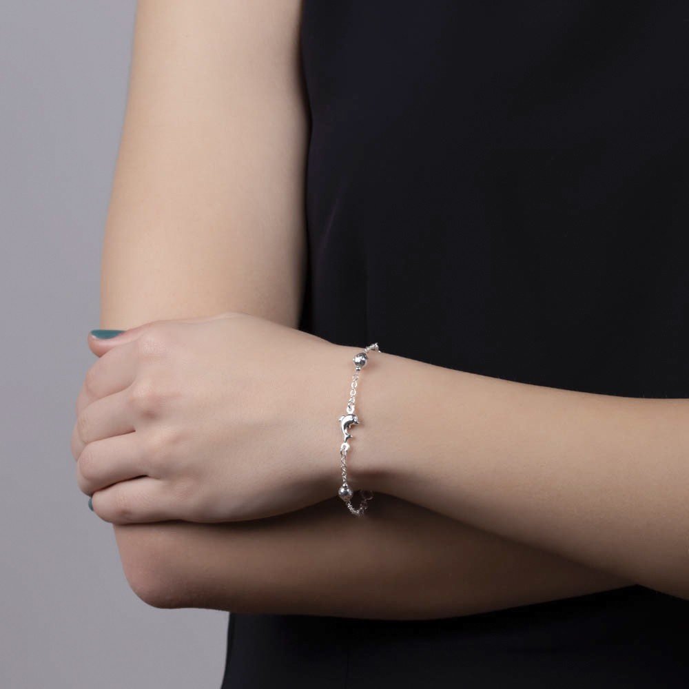 Pulsera Delfines y bolas marteladas de 6 mm. en Plata Ley 925 mm. Acabado pulido. Cierre mosquetón. Medida ajustable de 16 a 19 cm. Medida delfín 8,6 x 14 mm. Grosor cadena 2,2 mm.