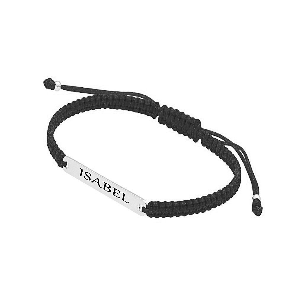 Minimalismo con carácter. Esta pulsera combina la nobleza de la plata de ley 925, trabajada en una delicada placa personalizable, con la calidez artesanal del macramé ajustable, creando una pieza versátil y atemporal. Tejido de macramé hecho a mano de color negro. Medida de largo ajustable. Ideal para grabar un nombre, fecha o palabra especial. Medida placa 4 x 35 mm.